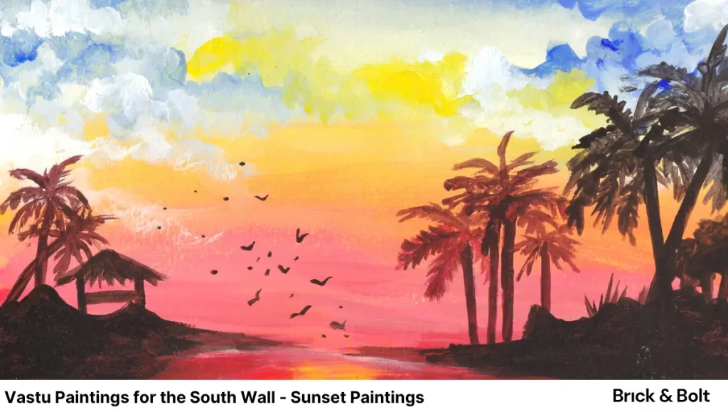 Natural sceneries that include bright colours namely pink and orange are well suited for south faced walls. These coloured paintings bring in warmth and fire energy to the place.